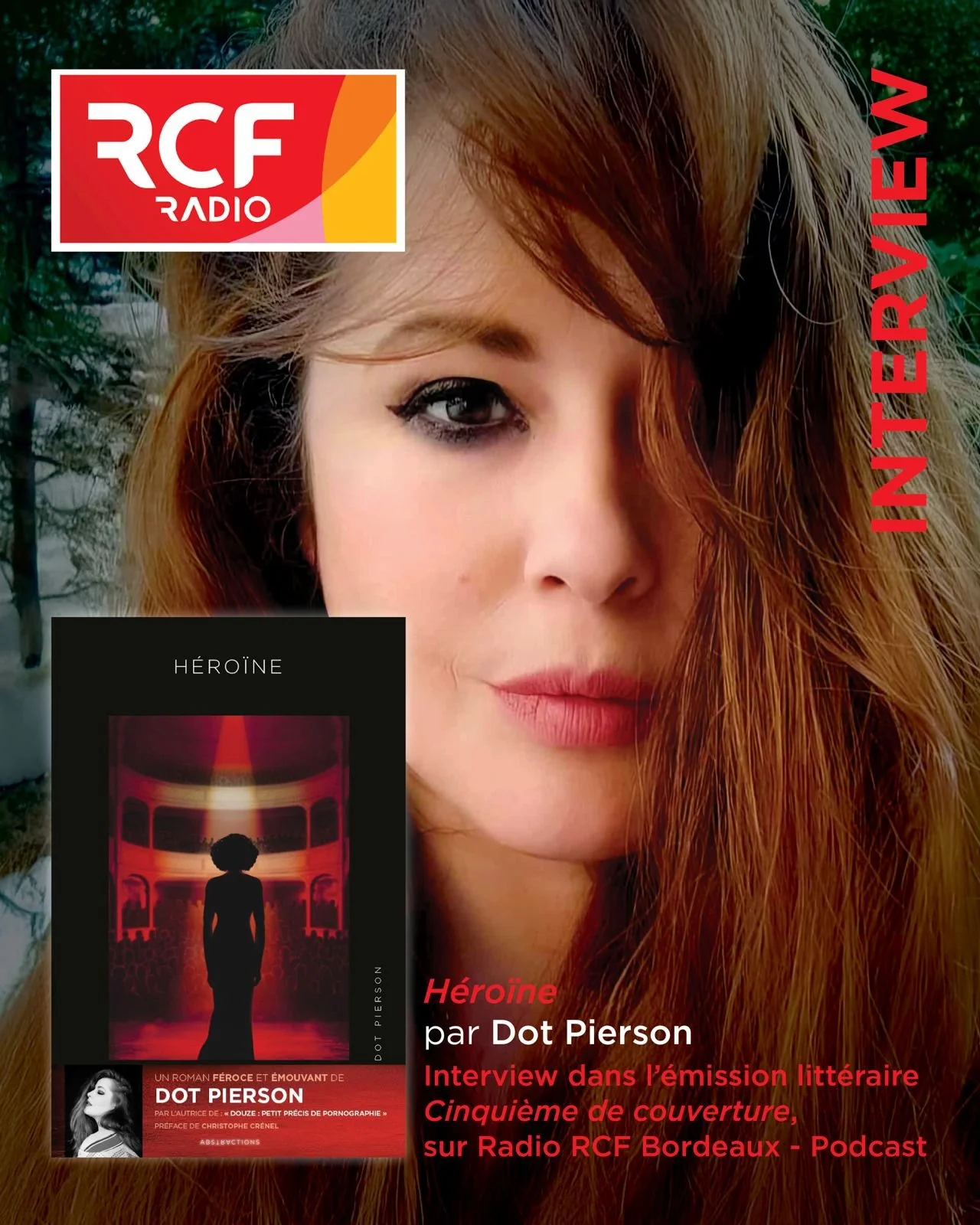 À l’occasion de la parution de son nouveau roman Héroïne, Dot Pierson était invitée au micro de Nicole Raymond dans l’émission littéraire Cinquième de couverture, sur Radio RCF Bordeaux.